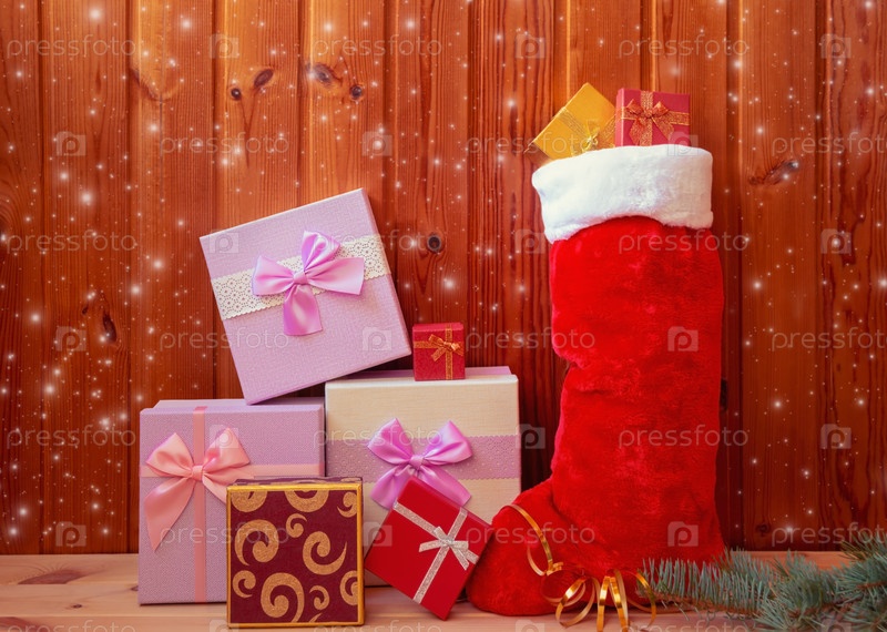 Рождественские пушистые чулки и подарочные коробки возле деревянной стены
