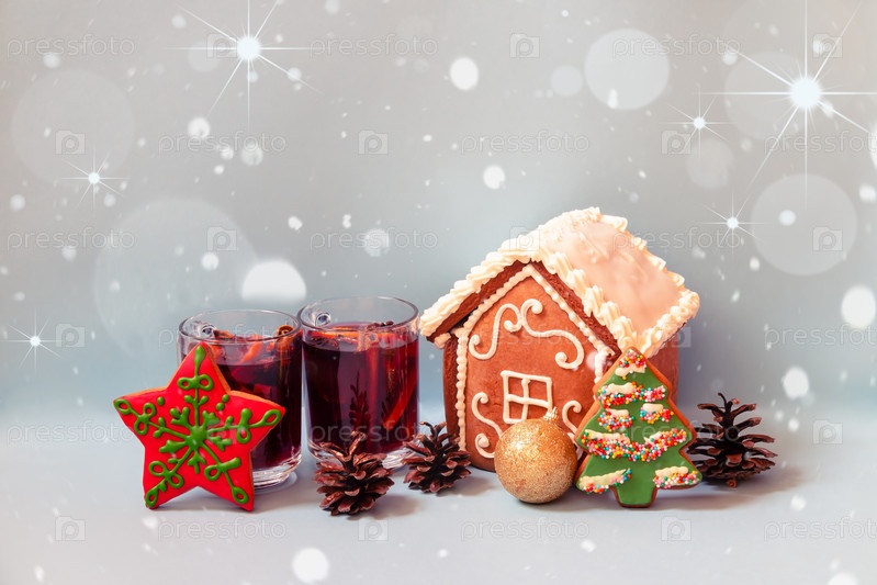 Маленький пряничный домик с глазурью, пряничным печеньем, бокалами глинтвейна и рождественским балом на синем фоне. Праздничное настроение