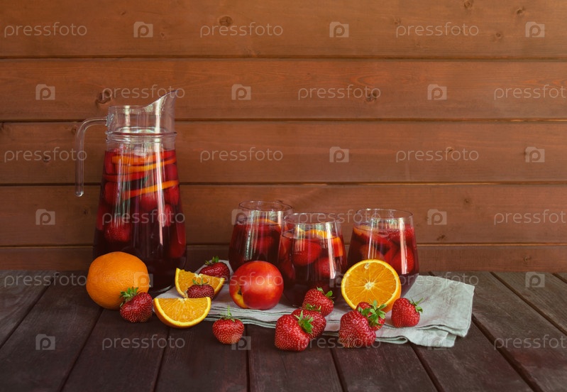 Домашняя сангрия из красного вина с фруктами в стаканах и кувшине и свежими фруктами рядом