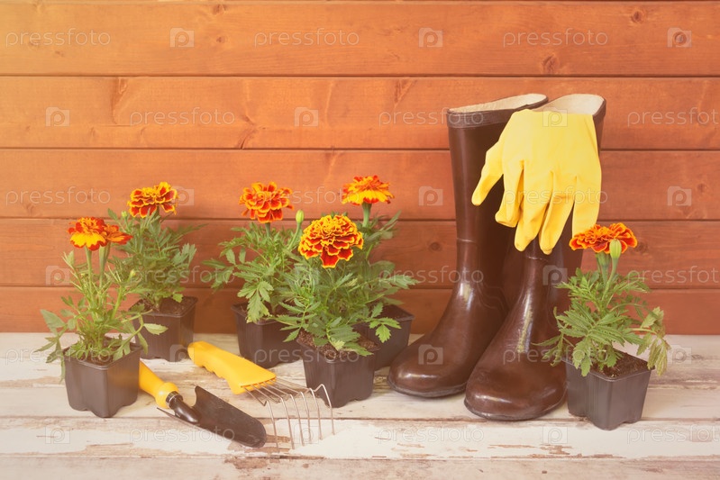 Резиновые сапоги, перчатки, саженцы цветов календулы и садовые инструменты на старом деревянном столе