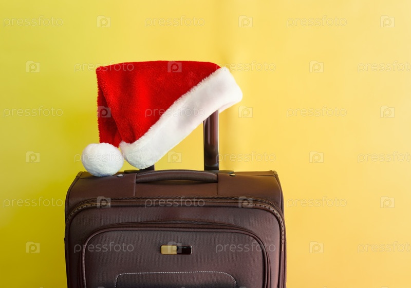 Коричневый чемодан и шляпа Санта-Клауса на желтом фоне. Концепция рождественских путешествий
