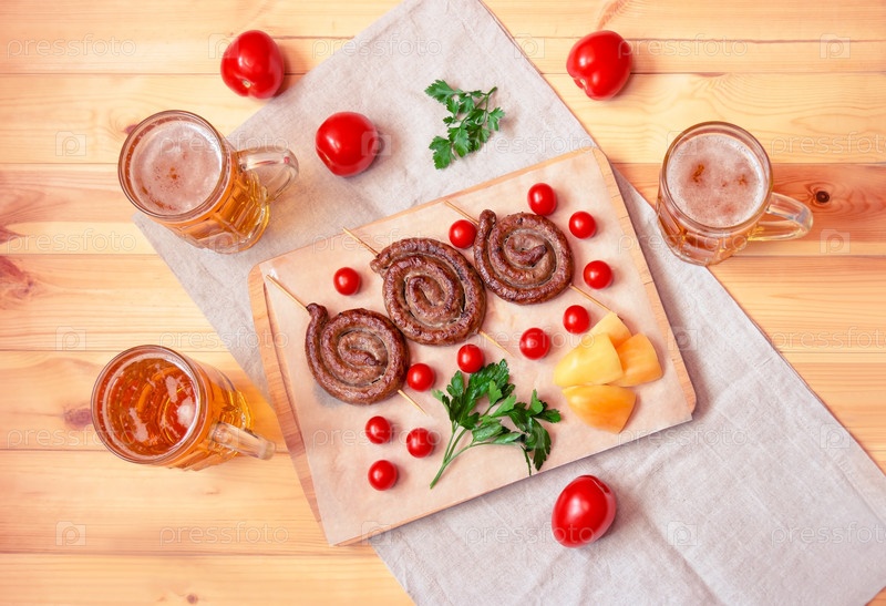 Пивные кружки и разделочная доска с жареными сосисками, помидорами черри, желтым перцем и свежей петрушкой на деревянном столе