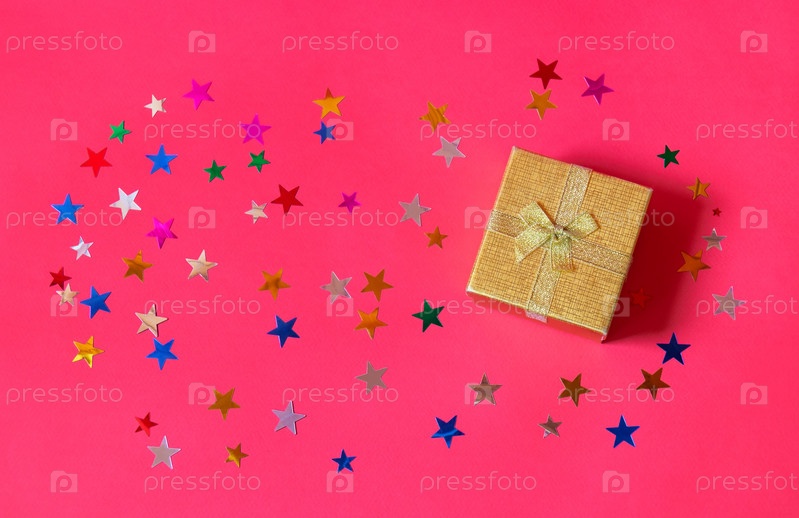 Золотая подарочная коробка и красочные яркие конфетти в форме звезд на розовом фоне. Вид сверху с копией пространства