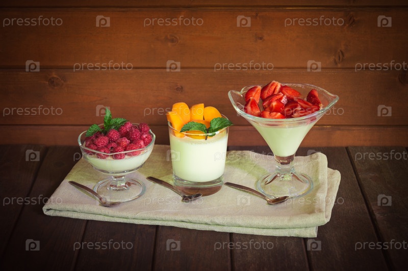 Домашняя вкусная итальянская десертная панна котта со свежей малиной, абрикосами и клубникой