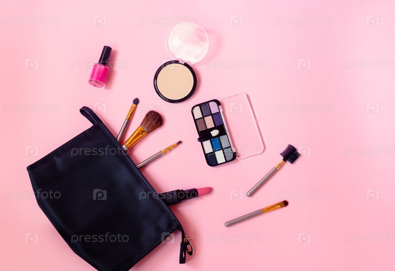 Косметичка с косметикой и кистями для макияжа на розовом фоне