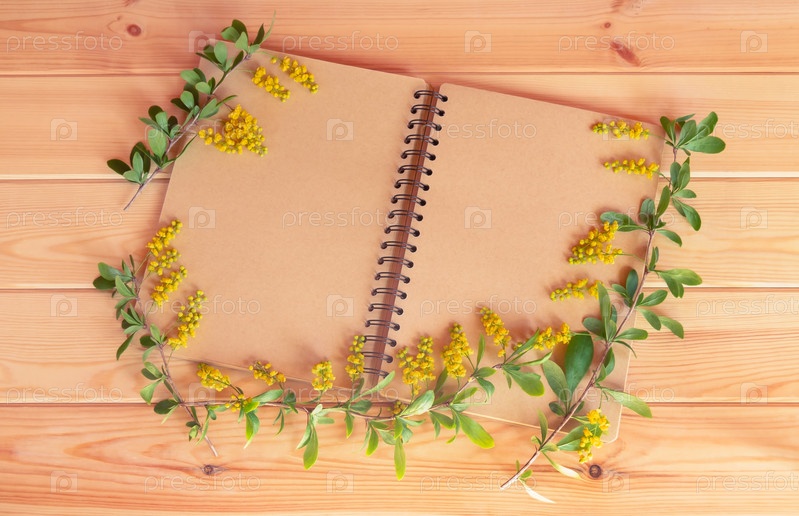 Пустой блокнот и желтые цветы барбариса на деревянном фоне. Вид сверху с копией пространства