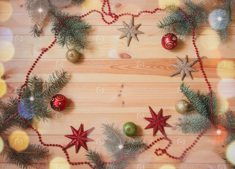 Новогодняя рамка из еловых веток и красочных рождественских украшений. Вид сверху, пространство для копирования