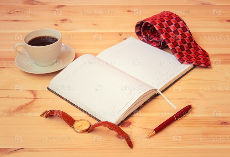 Свернутый галстук, дневник, часы, чашка кофе и ручка на деревянном столе. Выборочный фокус