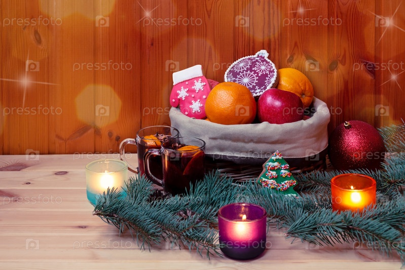 Плетеная корзина с пряниками и фруктами, бокалы с глинтвейном, рождественский бал и свечи в стеклянных подсвечниках. Просмотр с копией пространства