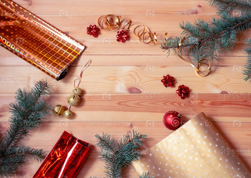 Новогодний фон с еловыми ветками, рулонами оберточной бумаги и украшениями. Подготовка к праздникам