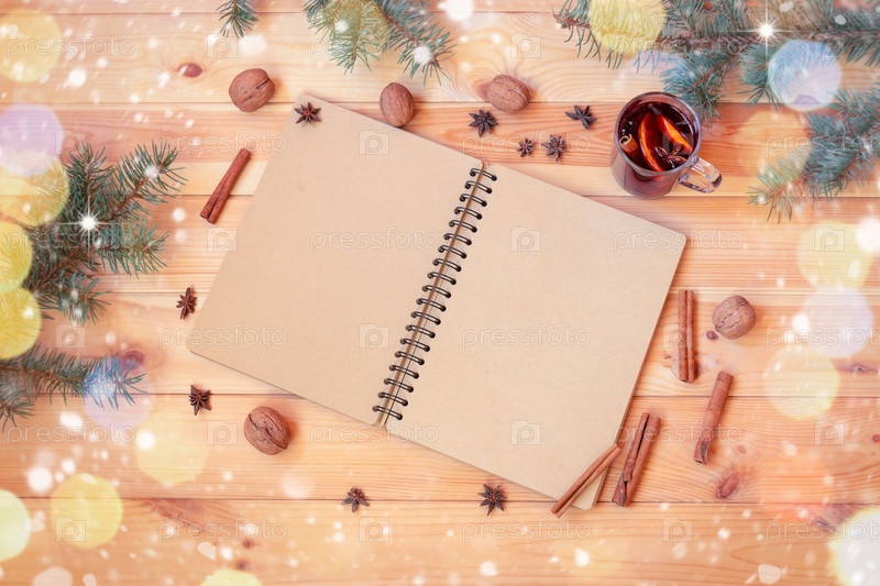 Открытая тетрадь, еловые ветки, стакан глинтвейна, специи и грецкие орехи на деревянном фоне. Вид сверху, пространство для копирования