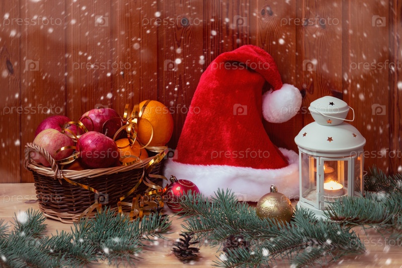 Пушистая шляпа Санты, плетеная корзина со свежими фруктами и горящий фонарь на деревянном столе