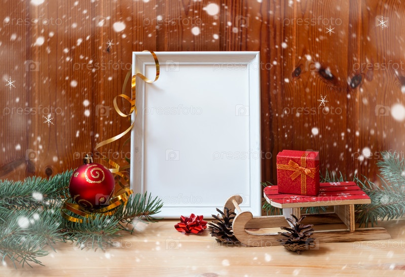 Белая фоторамка, Рождественский бал и подарок на деревянном столе. Просмотр с копией пространства