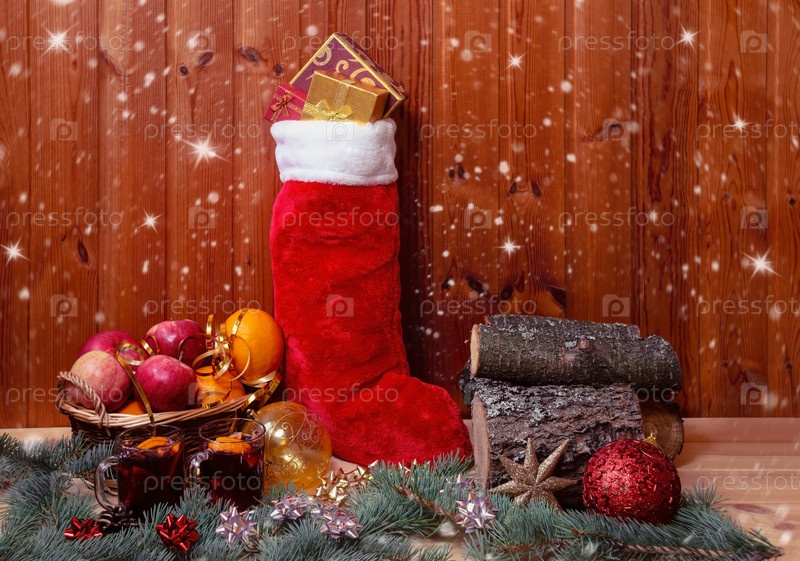 Плетеная корзина с фруктами, пушистый рождественский чулок, глинтвейн, куча дров и елочные шары. Просмотр с копией пространства
