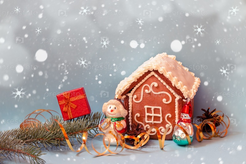 Маленький пряничный домик, красная подарочная коробка и рождественские украшения на синем фоне. Праздничное настроение