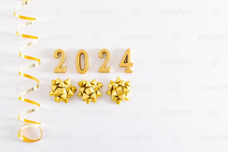 Золотые числа 2024 на фоне белой ткани с золотыми блестками, спиралью и звездами. место для текста. открытка. макет
