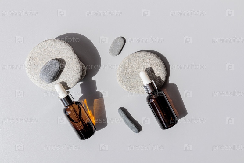 Два косметических флакона с пипеткой с натуральными органическими средствами по уходу за кожей лица всех типов лежат среди морских плоских камней. Вид сверху