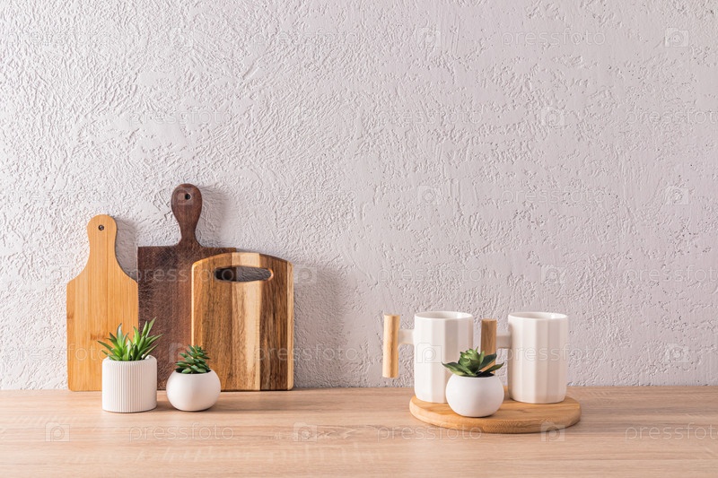 Красивый кухонный фон в минималистском стиле с двумя стильными керамическими кружками и набором различных деревянных разделочных досок. передний план