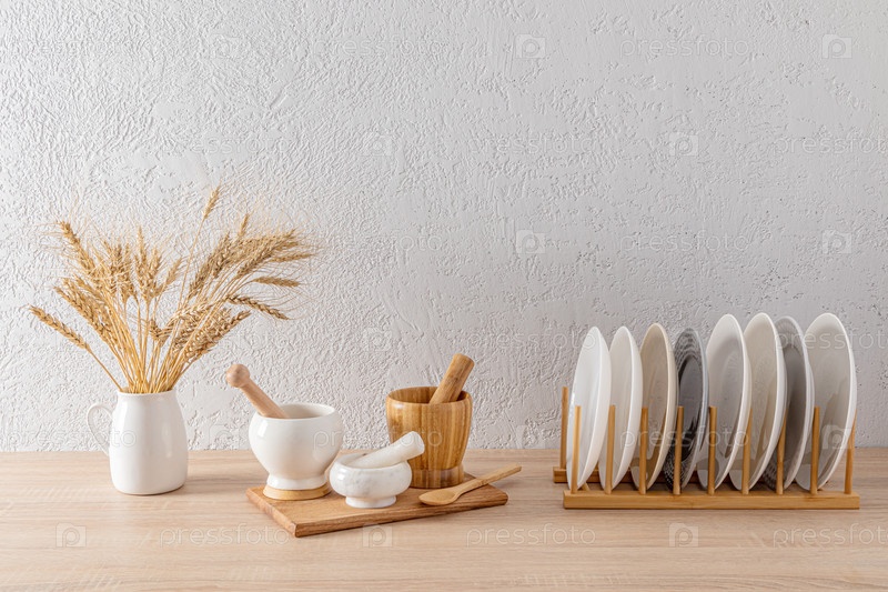 Красивый интерьер кухонной столешницы с различной кухонной утварью и декором в светлых тонах. экологически чистая кухня. Эко предметы
