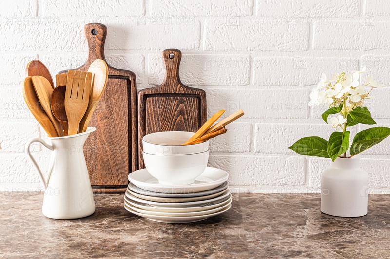 Красивая кухонная утварь из натуральных материалов на современной деревянной столешнице. Экологичная кухня без мусора и пластика