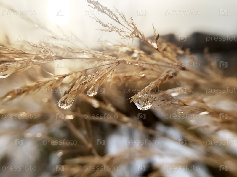 Замороженные кристаллы воды на сухой траве на фоне солнечного света