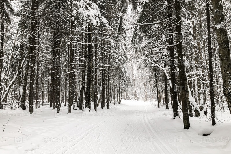 Снежная дорога с лыжными трассами через заснеженные деревья в зимнем лесном ландшафте