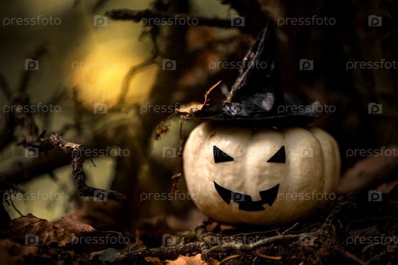 Хэллоуинская тыква с уродливой улыбкой в черной шляпе ведьмы в жутком лесу