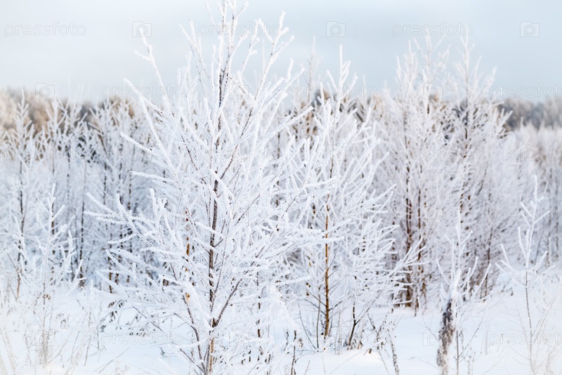 Замерзшее дерево, покрытое инеем в зимний день крупным планом