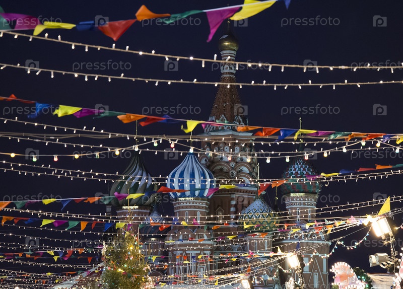Вид на собор Василия Блаженного через гирлянды флагов