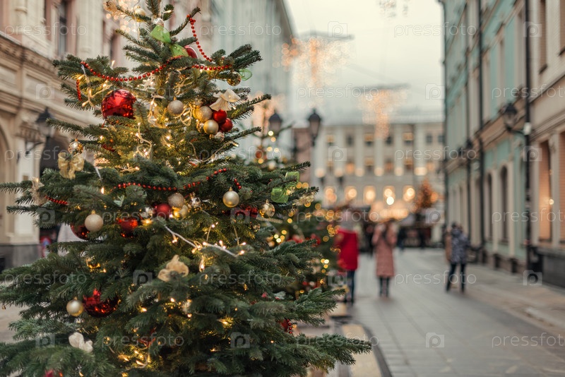 Рождественские елки, украшенные шарами и гирляндами на улице города. Концепция празднования счастливого Рождества и Нового года
