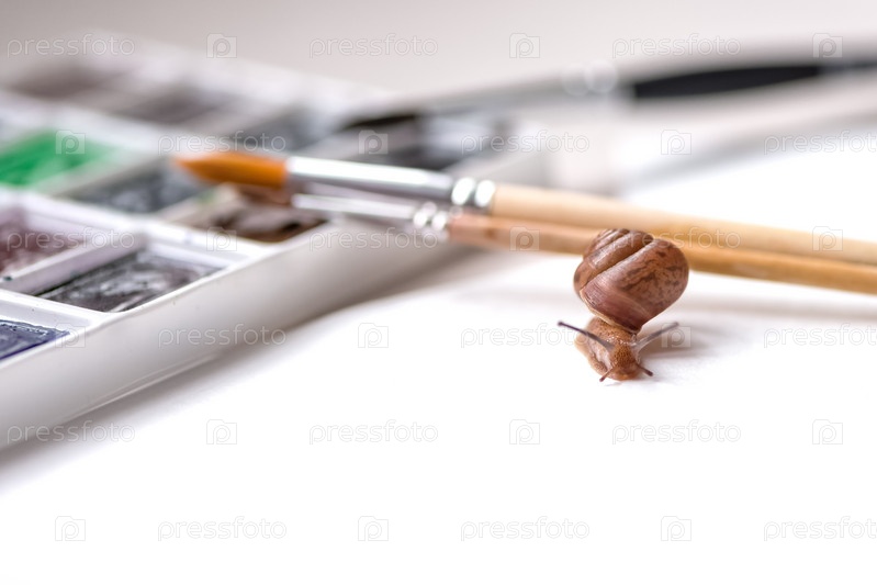 Маленькая любопытная улитка ползает по кистям возле акварельной палитры. Концепция искусства и творчества. Место для текста