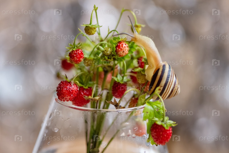 Садовая улитка ползает по веточке земляники