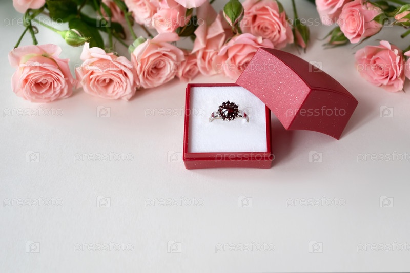Украшенное драгоценными камнями обручальное кольцо в открытой красной шкатулке, окруженной бледно-розовыми розами. празднование дня святого валентина
