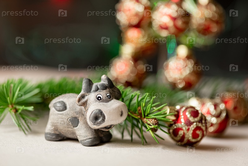 Симпатичный керамический бык как символ Нового 2021 года на размытом фоне рядом с еловой веткой и елкой, украшенной красным шаром