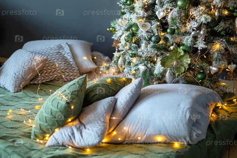 Домашний уютный интерьер с освещенными гирляндами подушками, разбросанными возле богато украшенной рождественской елки