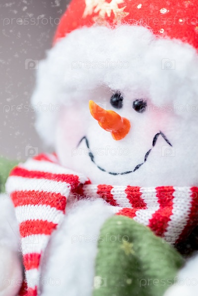 Крупным планом улыбающееся лицо милой игрушки снеговика на снежном фоне