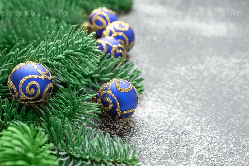 Рождественская граница из свежих еловых веток и блестящих голубых шариков с копией пространства для поздравлений