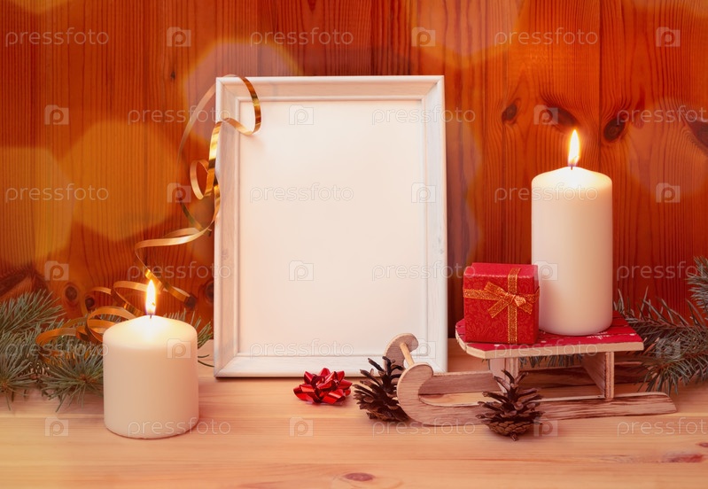 Белая фоторамка, рождественские свечи и подарок на деревянном столе. Просмотр с копией пространства