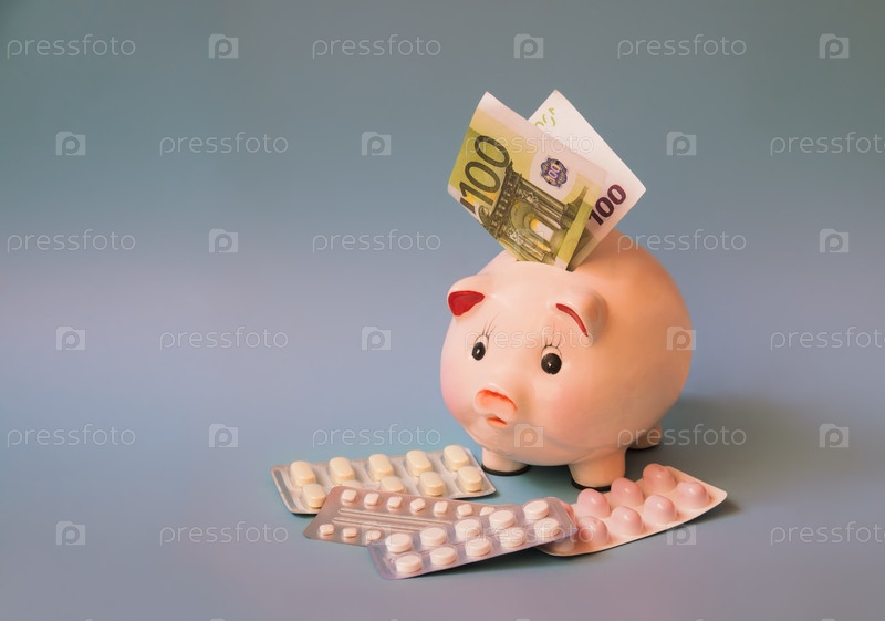 Копилка с банкнотой евро, вставленной в слот, и таблетками в волдырях на синем фоне