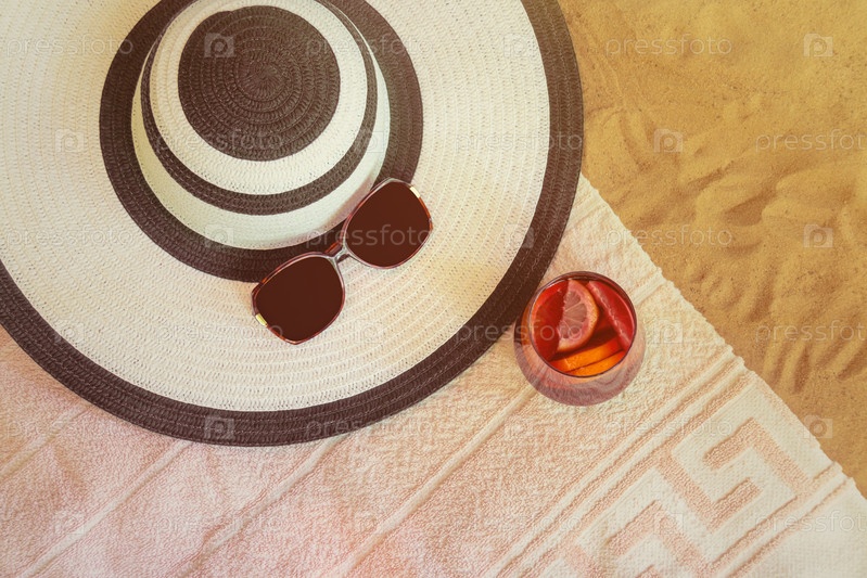 Большая пляжная шляпа, солнцезащитные очки, стакан сангрии и полотенце на песчаном пляже. Вид сверху