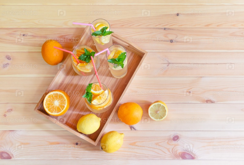 Холодный летний лимонад и апельсиновый лимонад на деревянном фоне. Выборочный фокус. Вид сверху, пространство для копирования