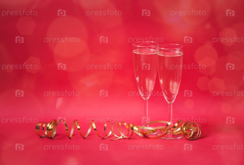Два бокала шампанского и золотая лента на розовом фоне. Просмотр с копией пространства