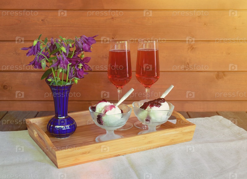 Фиолетовые полевые цветы аквилегии, бокалы розового шампанского и мороженое с мороженым с черничным сиропом на деревянном столе