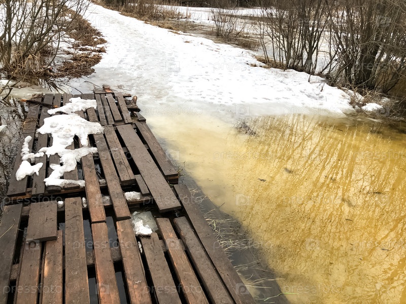 Деревянная дорожка над лужей растаявшего снега на дороге ранней весной
