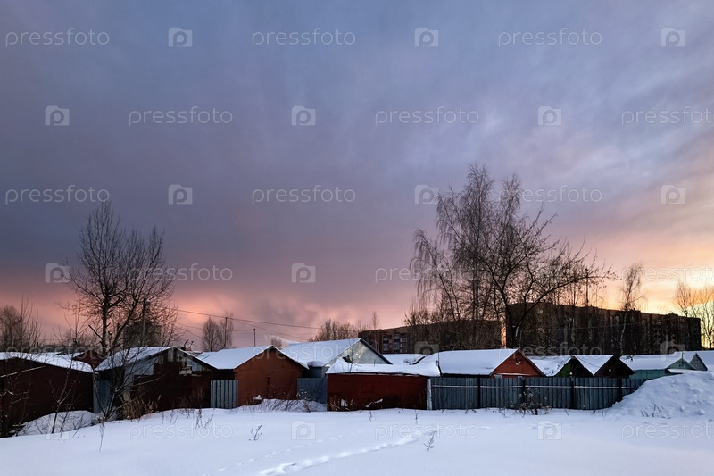 Закатное небо над заснеженными крышами деревенских домов
