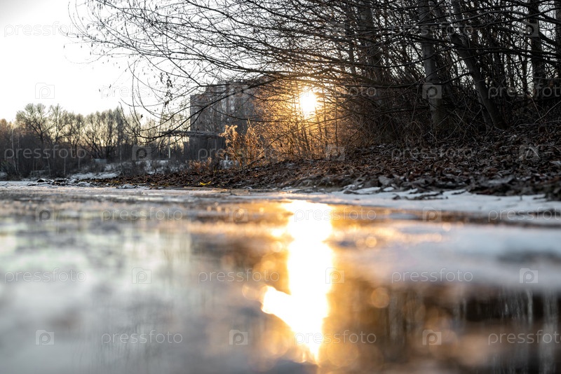 Солнечный луч пробивается сквозь ветки деревьев и отражается на ледяной поверхности зимнего пейзажа замерзшего озера