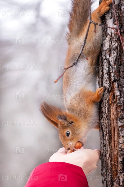 Белка берет орех из протянутой руки