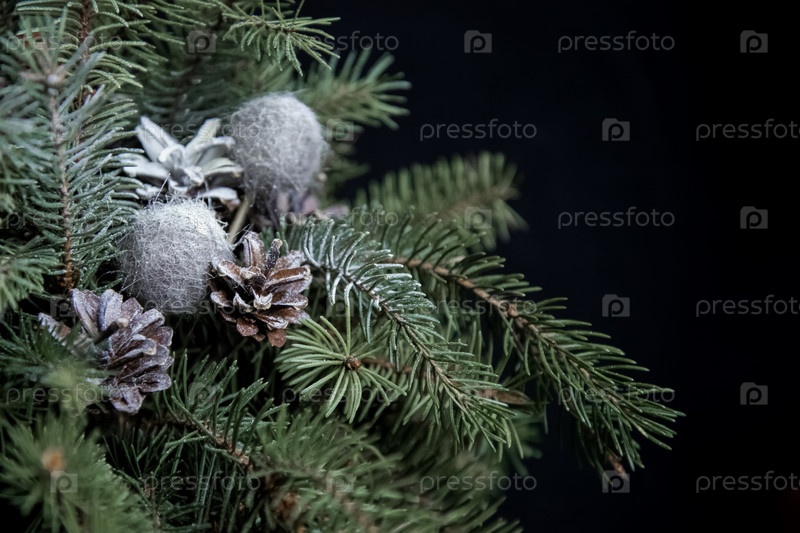 Рождественская композиция из еловых веток и шишек на черном фоне