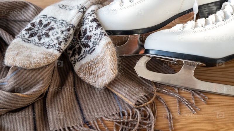 Зимняя квартира с белыми коньками для фигурного катания, теплым шарфом и варежками
