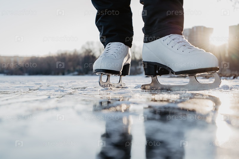 Женщина в белых фигурных коньках стоит на льду. Зимние занятия спортом на свежем воздухе